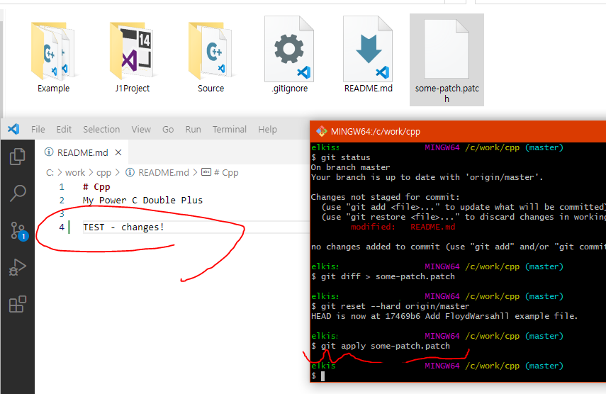 patch 만들기. README.md에 일부 내용 편집해서 some-patch.patch를 만든 상황입니다.
