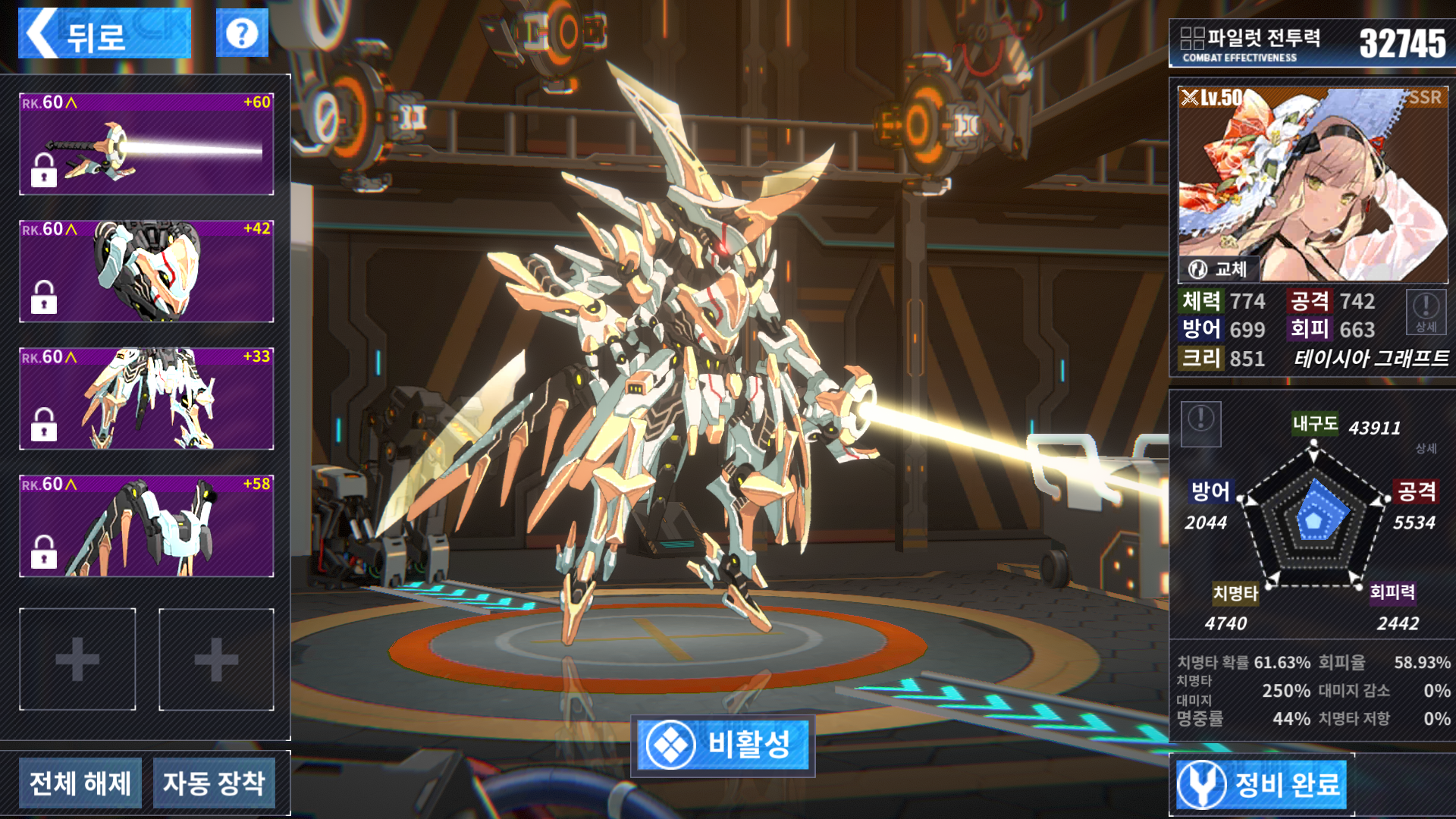 테이시아 50레벨, 성급은 5성에 스작을 모두 4작까지 해주고 전용기 강화도 좀 해줬습니다.