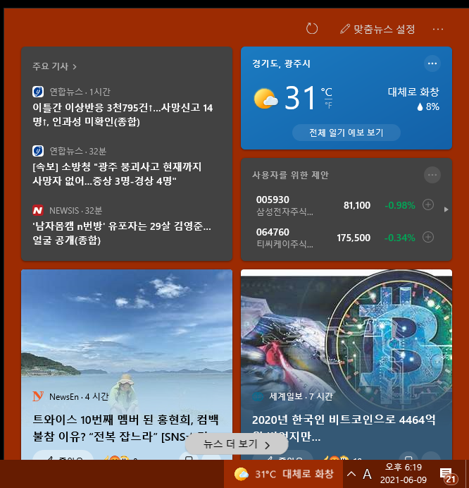 이번 윈도우 업데이트 때문인지 갑자기 작업표시줄 우측하단에 날씨가 등장했다;;;;