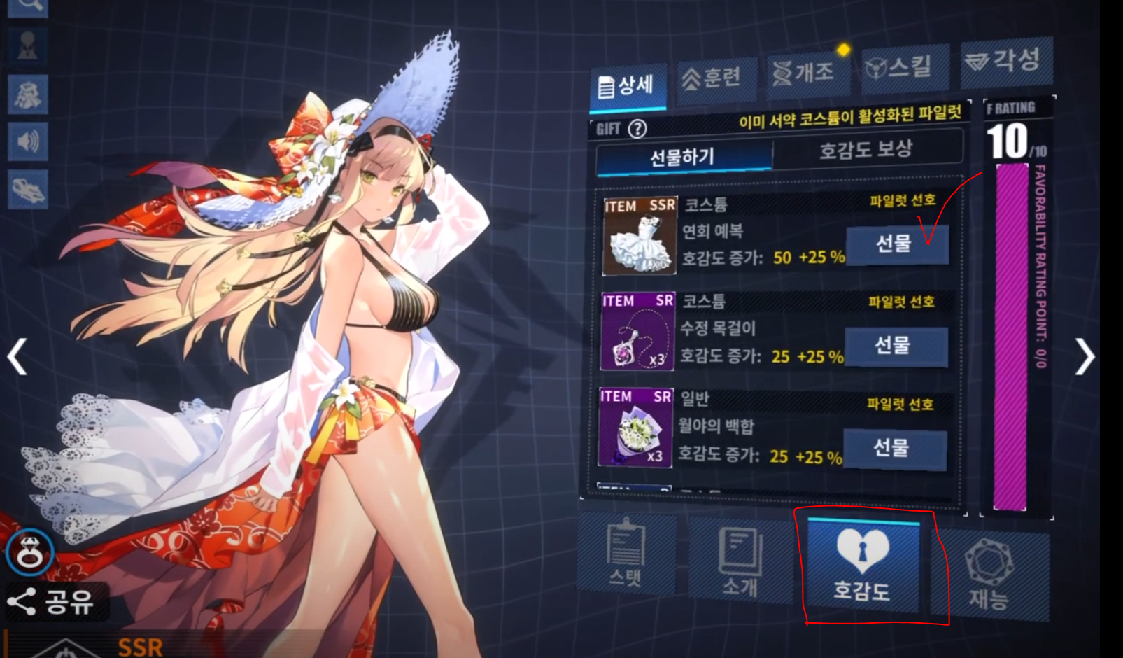 호감도 탭에서 선물을 주면 다양한 보상과 호감도 상승이 돼요.